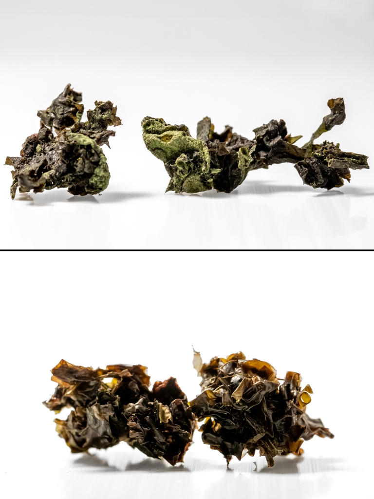 Caption: Unhealthy and healthy seaweed collected by lifelong Tlingit black seaweed harvester Irene Dundas in the Ketchikan area. Photos by Stacy Unzicker, courtesy of Sealaska Heritage Institute.