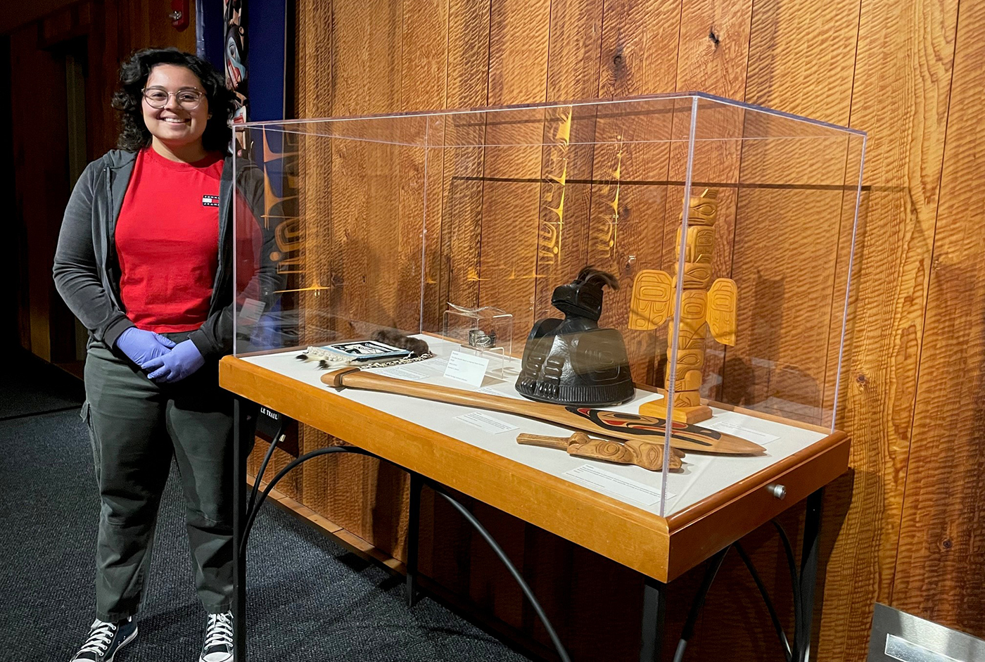Caption: SHI 2023 museum intern Jordan Martinez near one of the institute’s exhibits. Photo by Kaila Cogdill, courtesy of SHI. Note: news outlets are welcome to use this photo for coverage of this story. For a higher-res version, contact therese.pokorney@sealaska.com